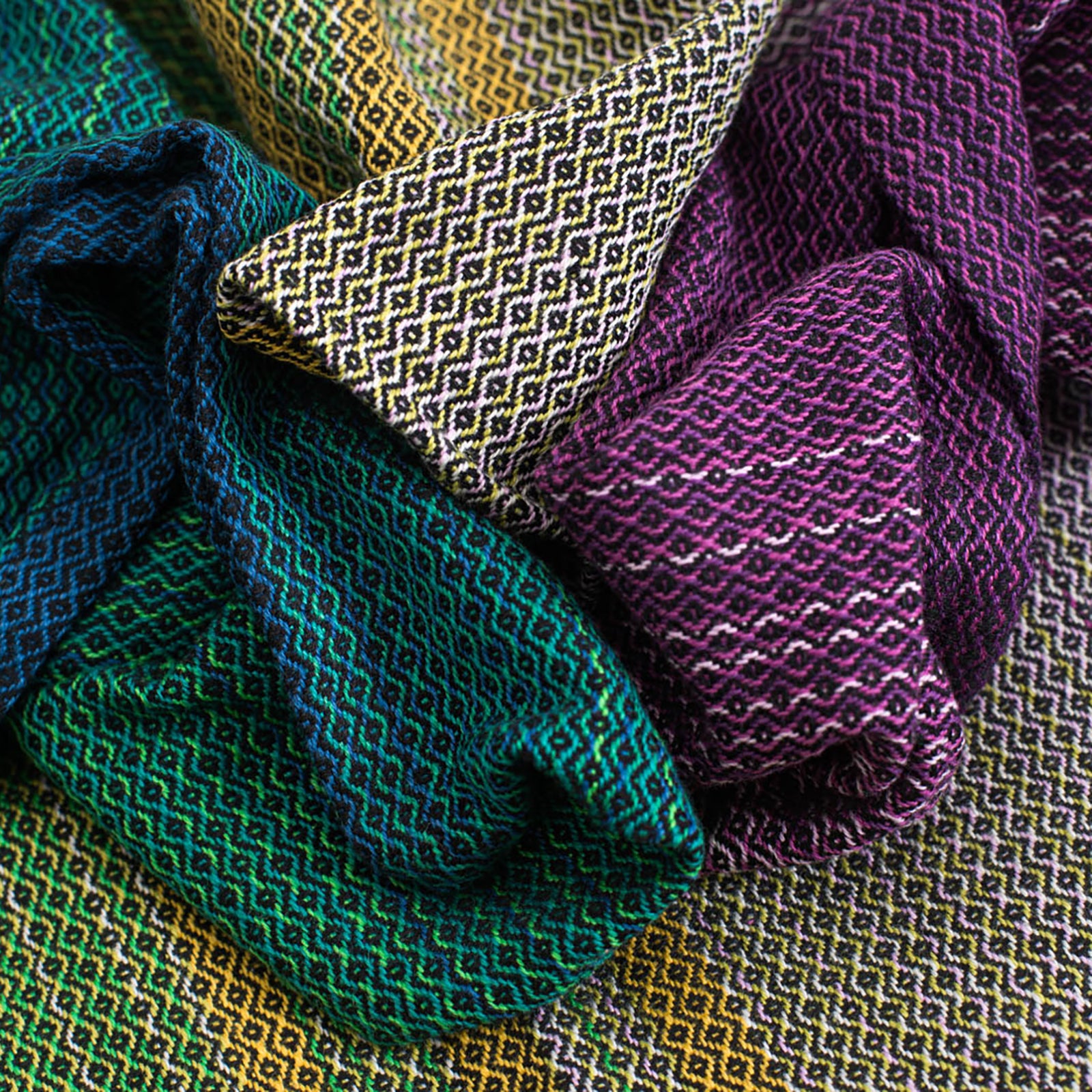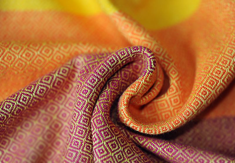 Die Webart Diamant ist in Handarbeit aufwändiger herzustellen, deshalb sind die Tücher dieser Webart in der Regel etwas teurer als Kreuzköpertücher. Das Flächengewicht beträgt etwa 228 g/m². Diamanttücher sind besonders kuschelig auch ohne langes Eintragen. Die Webart Diamant ist wunderbar für Neugeborene geeignet. Für sehr schwere Kinder und einlagige Bindeweisen sind Diamanttücher nicht mehr unsere erste Wahl. Ausgenommen Diamant mit double weft/doppeltem Schussfaden, natürlich.
