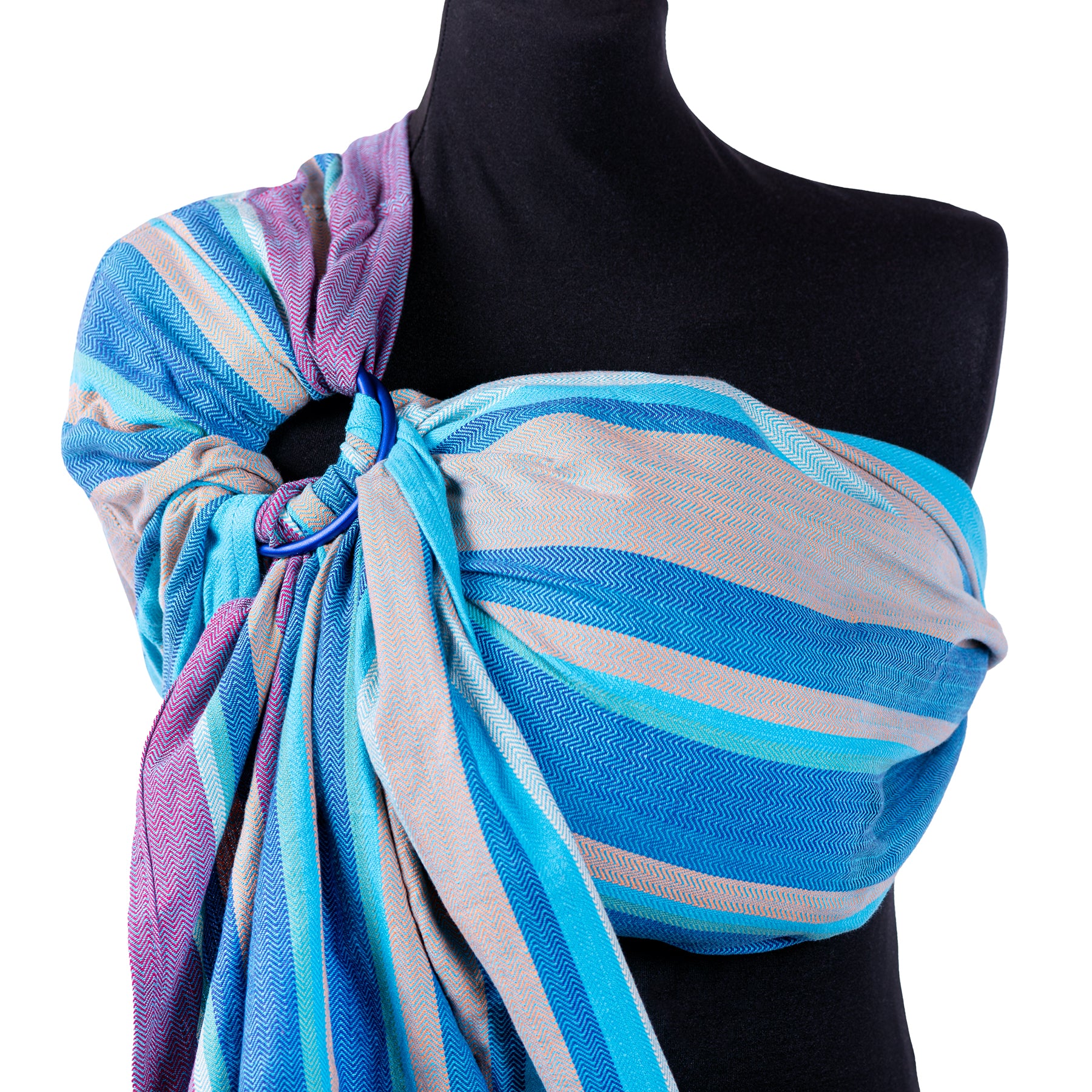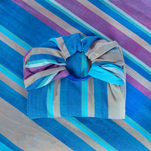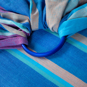 Der Ringsling wird aus einem Tragetuch in bewährter Kreuzköper-, Fischgrat oder Diamantköperwebung mit speziell angefertigten Aluminium-Qualitätsringen gefertigt, gerafft vernäht und ist in zwei Längen erhältlich.